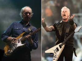 Recalling his reaction to the material, the guitarist says, “It was okay. But once we got to Dublin, the thing that threw me was, I was trying out this Marshall amp, and Metallica walked in sort of like cartoons. They said, ‘Hey, man, when we do this, we tune our guitars a whole tone down.’ I thought, ‘A whole tone? The guitar is going to sound like a fucking banjo…’ But I don’t know; I didn’t really know them.”